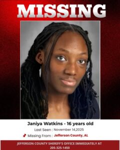 Janiya Watkins Missing—Jefferson County, Alabama, is on high alert following the disappearance of 16-year-old Janiya Watkins, who has been missing since November 14, 2025. Authorities and her family are deeply concerned for her safety, emphasizing the urgency of locating her as quickly as possible. Janiya was last seen in the 800 block of Chalkville School Road, walking toward Huffman in Jefferson County.